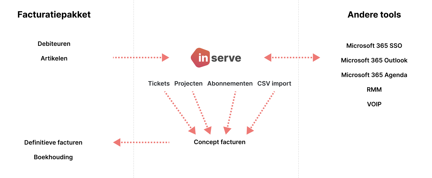 Alle conceptfacturen worden vervolgens geëxporteerd naar het facturatiepakket. Via je facturatiepakket worden ze daadwerkelijk verstuurd naar de klant. Het debiteurenbeheer, sturen van herinneringen, bankkoppeling en de boekhouding gebeuren dus buiten Inserve.