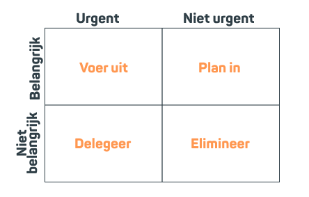 Het kwadrant van Eisenhower kan je hierbij helpen. Je deelt je taken in over de assen belang en urgentie en krijgt zo vier vakken. Alles in de categorie ‘belangrijk’ en ‘urgent’ spreekt voor zich: die taken moet je uitvoeren. Aan de andere kant hebben we ‘niet belangrijk’ en ‘niet urgent’. Bij deze taken moet je je goed afvragen of je ze überhaupt wel moet doen.