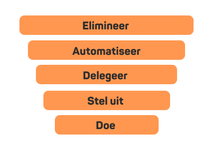 Een andere manier om naar je takenlijst te kijken, is een concept dat de ‘focus funnel’ heet. Deze trechter helpt ons om ons te richten op effectief werk. De funnel bestaat uit de volgende ‘trechters’ waar je de taak doorheen laat lopen: